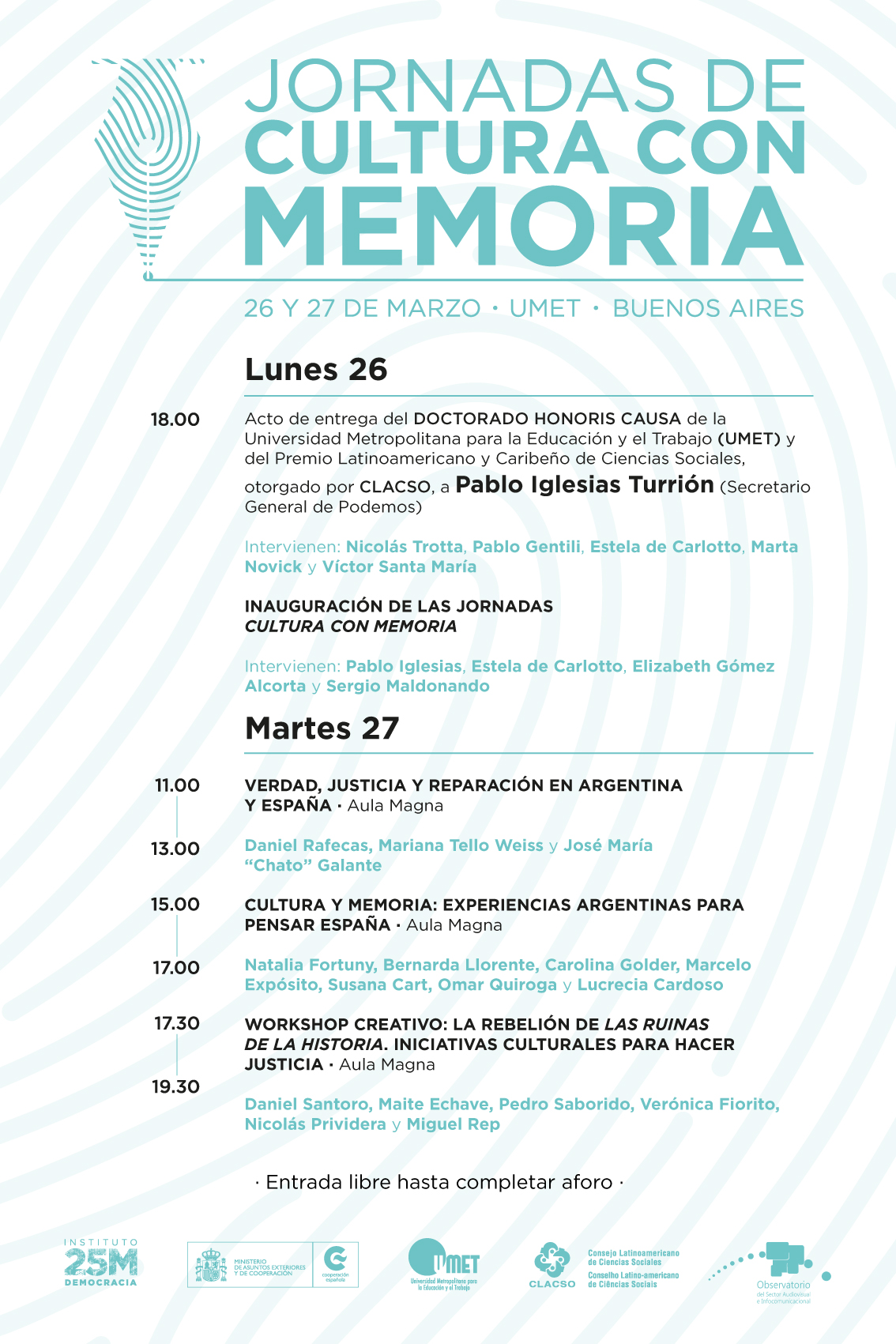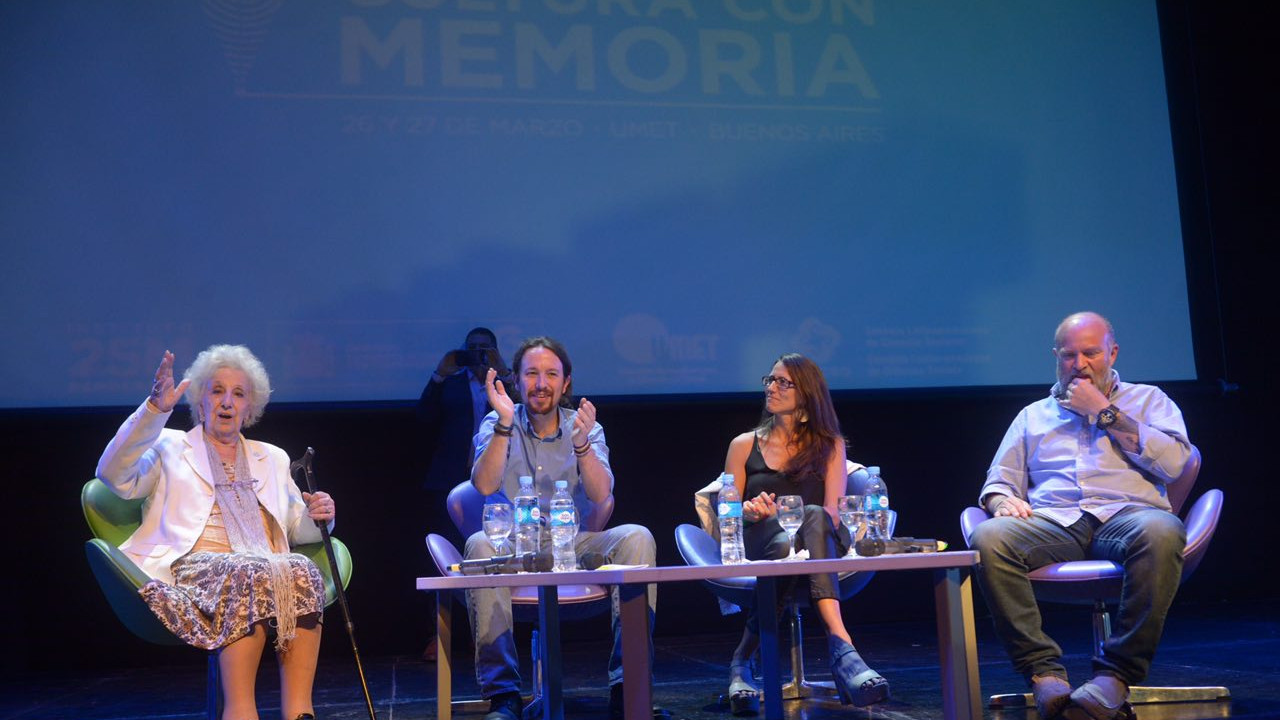El objetivo de las jornadas Cultura con Memoria, celebradas el 26 y 27 de marzo de 2018 en la Universidad Metropolitana para la Educación y el Trabajo (UMET), fue la puesta en común de las principales demandas y avances en el ámbito de la verdad, la justicia y la reparación de las víctimas en España y Argentina, así como la búsqueda de herramientas que nos ayuden a reconstruir nuestras memorias colectivas con los lenguajes de la cultura. El Instituto 25 de Mayo para la Democracia (I25M) reunió en Buenos Aires a organizaciones proderechos con creadores e intelectuales para trabajar sobre la idea del Angelus Novus de Walter Benjamin: “¿Qué pasa cuando los vivos no hacen justicia con los muertos?”. La rebelión de “las ruinas” de la Historia se nos presenta como un retorno de justicia y un ejercicio reparador del pasado imperfecto en nuestro presente.